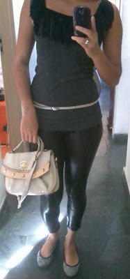 A blusa de franjas que ganhei no dia dos namorados ficou em perfeita harmonia combinada com a calça, porque é mais compridinha. Coloquei o cinto para marcar a cintura e completei com a sapatilha de tachas.
